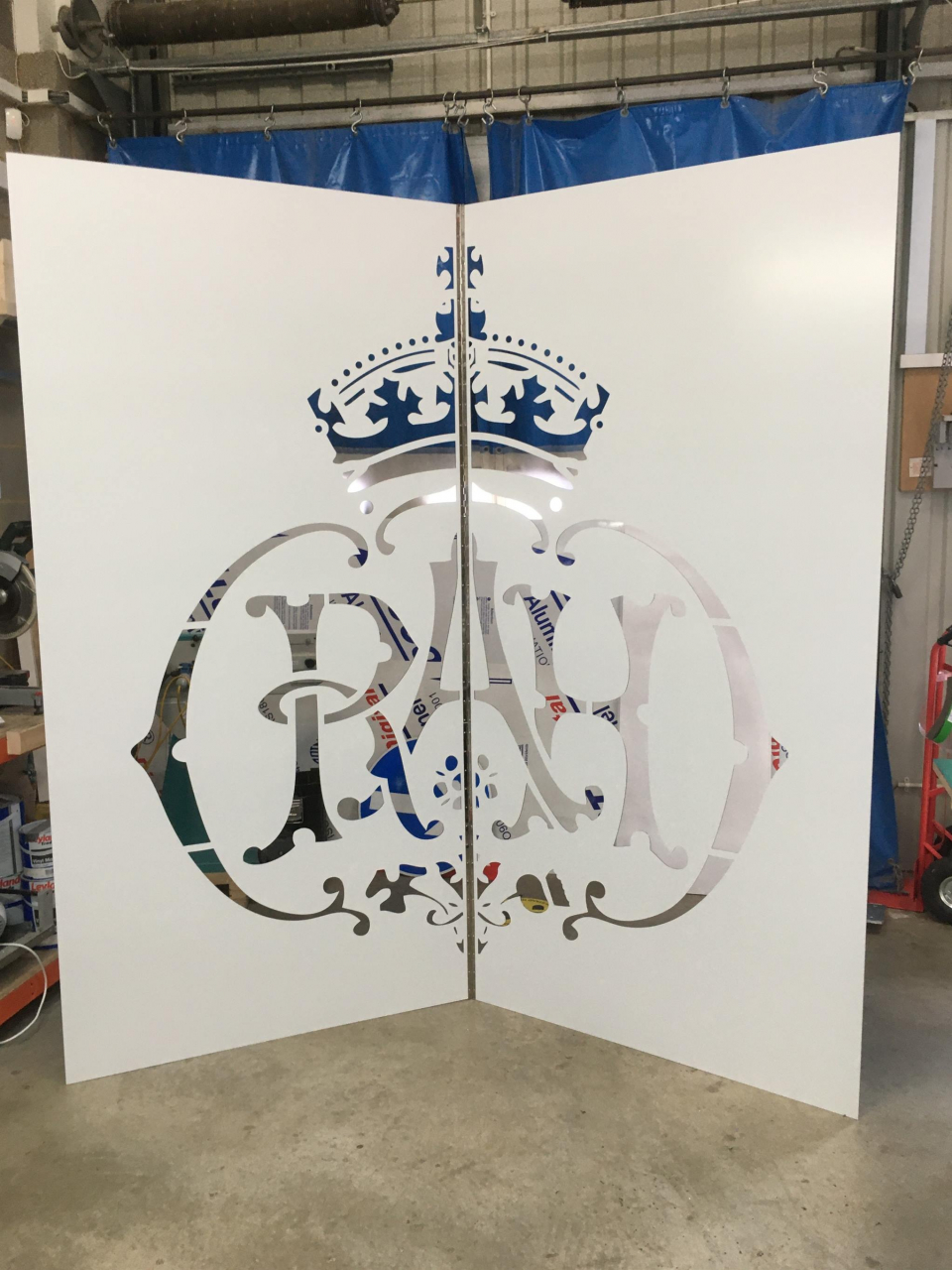 The Royal Albert Hall logo was imported into our design software. By creating a simplified version of the logo which included holding tags, so the logo could be replicated without compromising on the overall design.  We then were able to CNC the logo manufactured from 2 equal sections. Both sections where then riveted by the use of a continuous piano hinge.